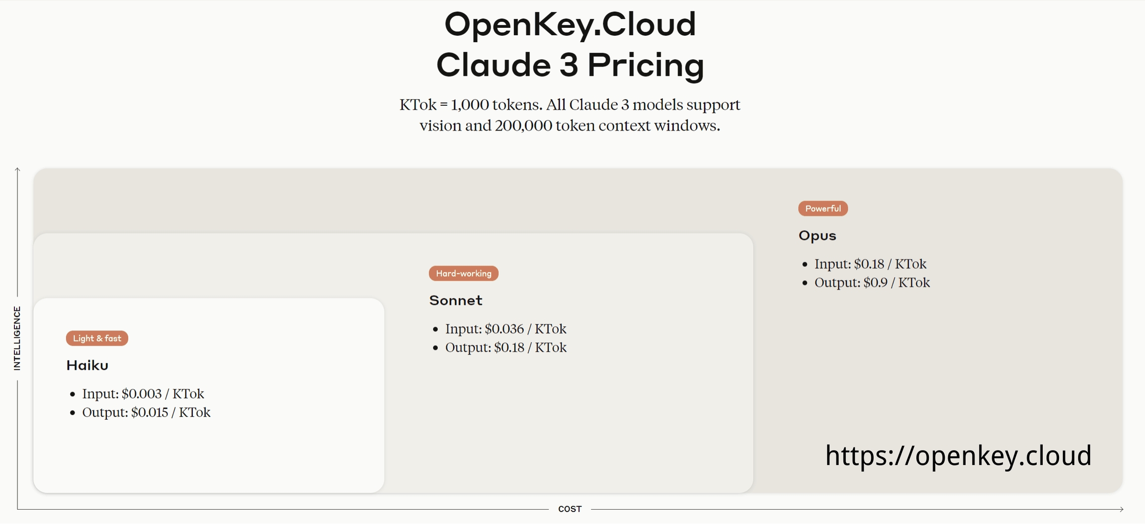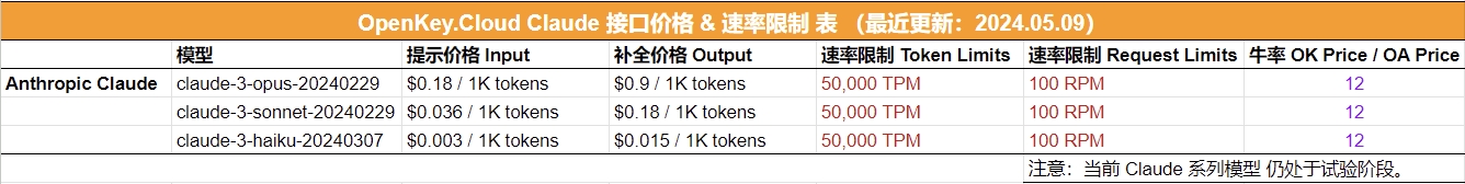 2024年5月9日,OpenKey.Cloud 试验性支持Anthropic旗下Claude 3系列模型,具体如下: