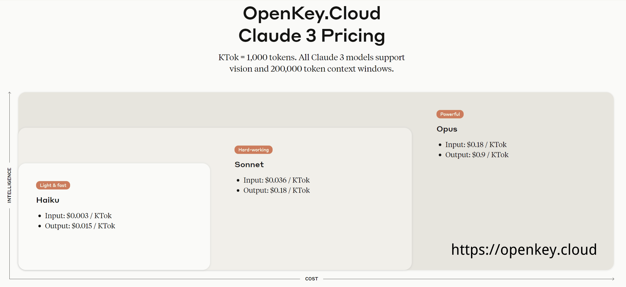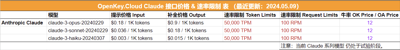 2024年5月9日，OpenKey.Cloud 试验性支持Anthropic旗下Claude 3系列模型，具体如下：